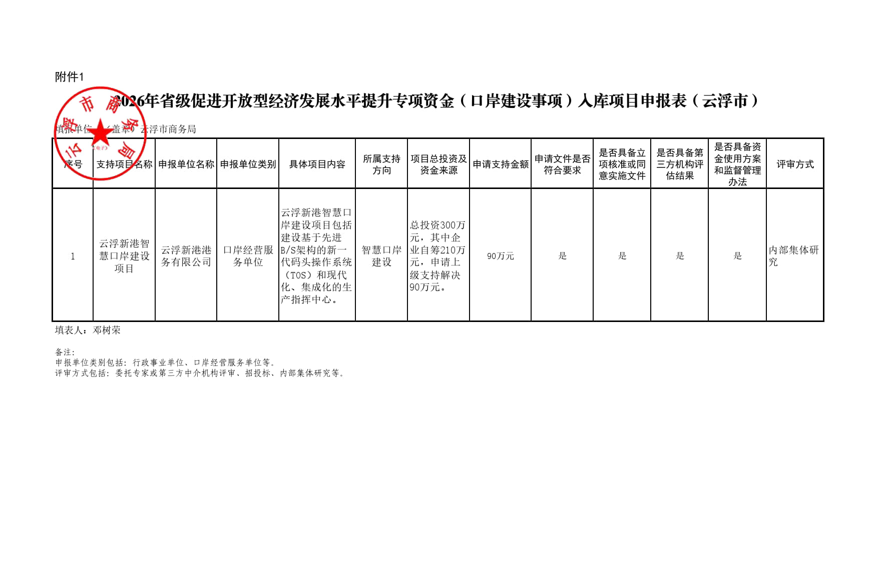 附件:2026年省级促进开放型经济发展水平提升专项资金(口岸建设事项)入库项目申报表(云浮市)