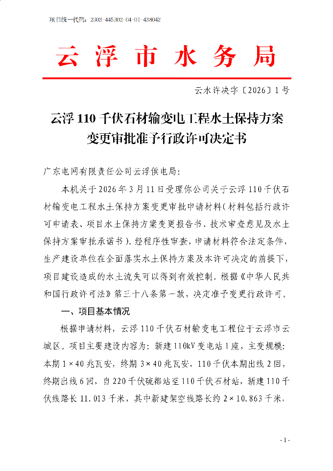 云浮110千伏石材输变电工程水土保持方案变更审批准予行政许可决定书