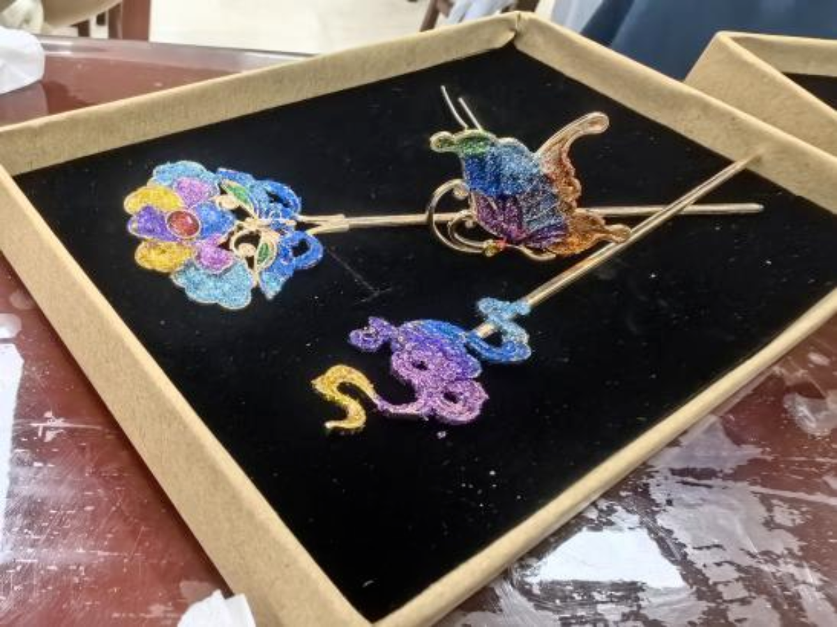随后,在老师的指导下,把釉料放进饰品的空隙里,抹上渐变与晕染,装点出色彩的绚丽与斑斓。一件件栩栩如生的景泰蓝饰品在大家的巧手中诞生了。