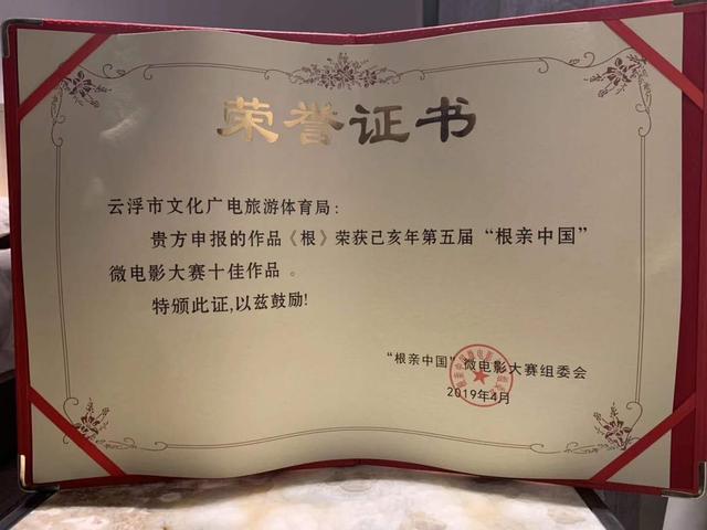 4月4日,由中国电影家协会主办的2019己亥年第五届“根亲中国”微电影大赛颁奖典礼在河南艺术中心举行,由云浮市委宣传部、云浮市文化广电旅游体育局、珠江电影集团联合打造,反映云浮市长岗坡精神的微电影《根》,从全国超过一千部参赛作品中脱颖而出,获得本次大赛的“十佳作品”奖。