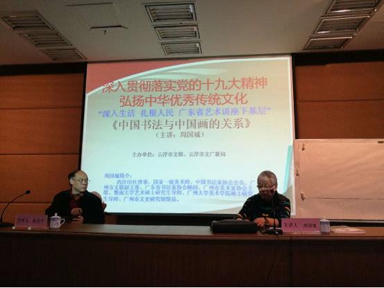 2017年11月7日上午,为深入贯彻落实党的十九大精神,由云浮市文广新局、云浮市文联主办,云浮画院、云浮市图书馆承办的“深入生活 扎根人民 广东省艺术讲座下基层”一一《中国书法与中国画的关系》讲座在云浮市图书馆举行。西泠印社理事、国家一级美术师、广州市美术家协会主席、暨南大学艺术硕士研究生导师周国城先生主讲。云浮市各县市区艺术爱好者及中小学美术教师参加了本次学习活动。