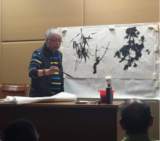 周先生生动地结合自己的成长经历讲述了中国画和西方绘画的异同,指出中西方绘画艺术的核心差异在于西方绘画是科学,中国画则是哲学。并剥茧抽丝地从中国画和书法的发展历史渊源来探讨中国写意画和书法的关系,用生动的案例赏析了吴昌硕、黄宾虹等大师的作品,论述了书画中墨色和力度的共通之处,剖析了“三绝”和“四会”,并称诗、书、画、印四位一体方能达到中国画的最高境界。同时,鼓励大家不仅要向前人学习,更要坚持自己的艺术追求,加强文化积淀,提高审美能力和驾驭毛笔的能力。
