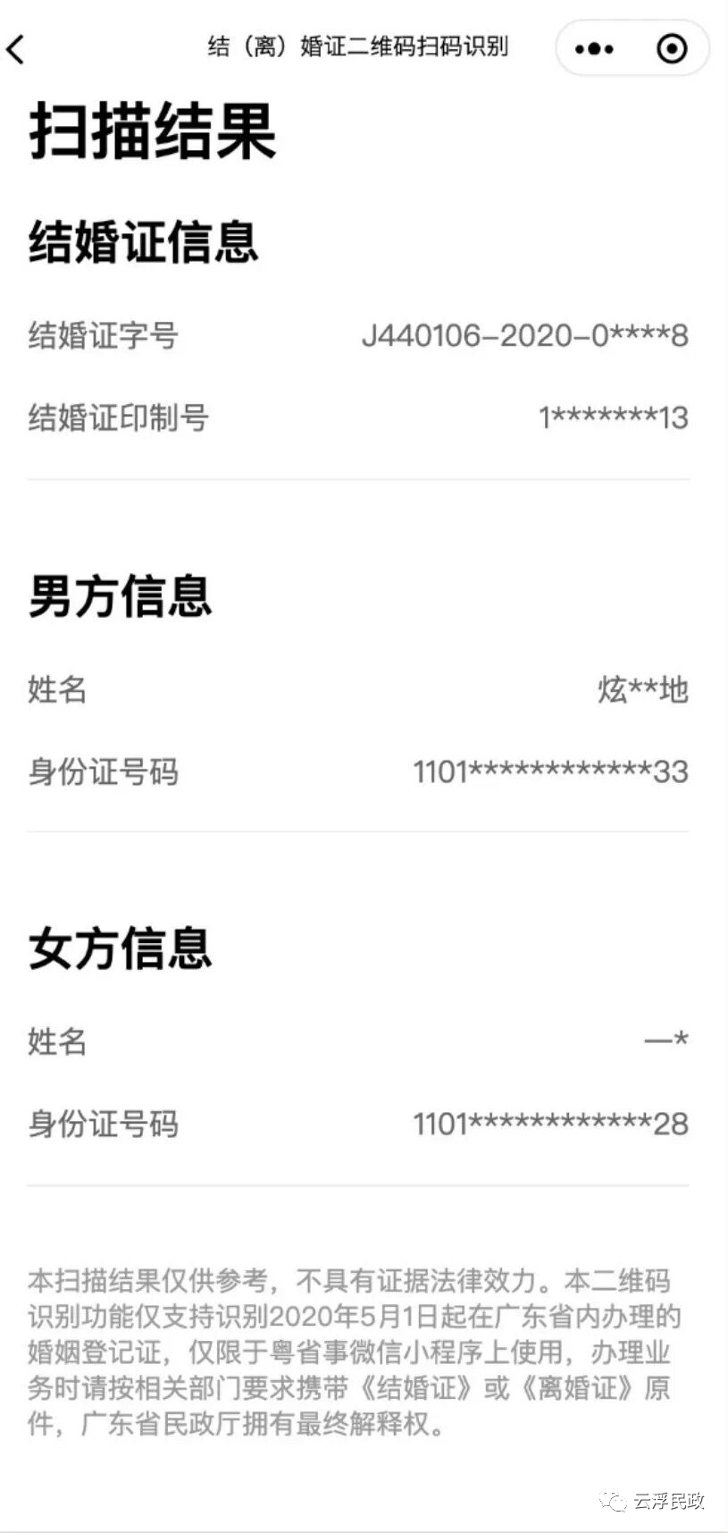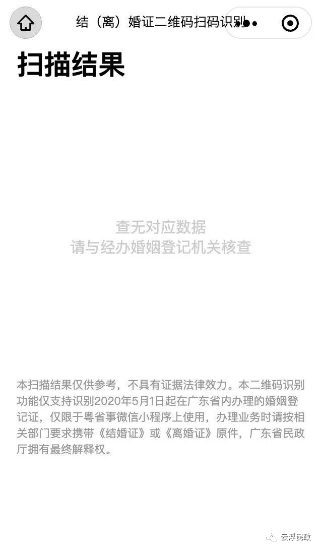在“粤省事”平台扫码后,将通过后台调用“广东省婚姻信息管理系统”数据与二维码相对应的“值”进行对比。如二维码的信息与系统信息一致的,显示