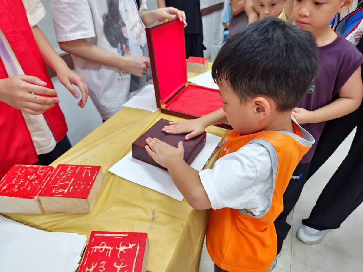 活动现场,孩子们不仅学习了篆刻的基本技巧,还使用了不同的中国字体,例如有隶书、篆书、金文、楷书、行书等等,每一个字都饱含着中华传统文化的博大精深,更深刻体会到了印章背后的文化内涵。一枚枚小小的印章,有的刻上了“祖国万岁”,有的则是“我爱中华”,每一个字都饱含深情,仿佛诉说着对祖国母亲最真挚的祝福。随着刻刀的每一次落下,爱国之情也在孩子们心中悄然生根发芽。