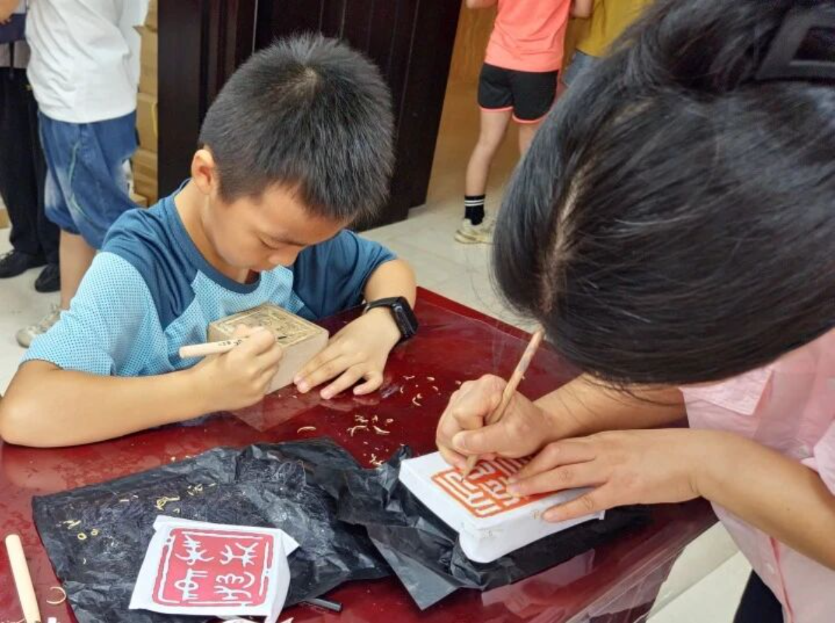 “这是我第一次尝试篆刻,一开始觉得很难,但当我刻出‘我爱中华’这四个字时,我觉得特别自豪!我感觉自己好像和古人有了一种连接,这种感觉很奇妙。”