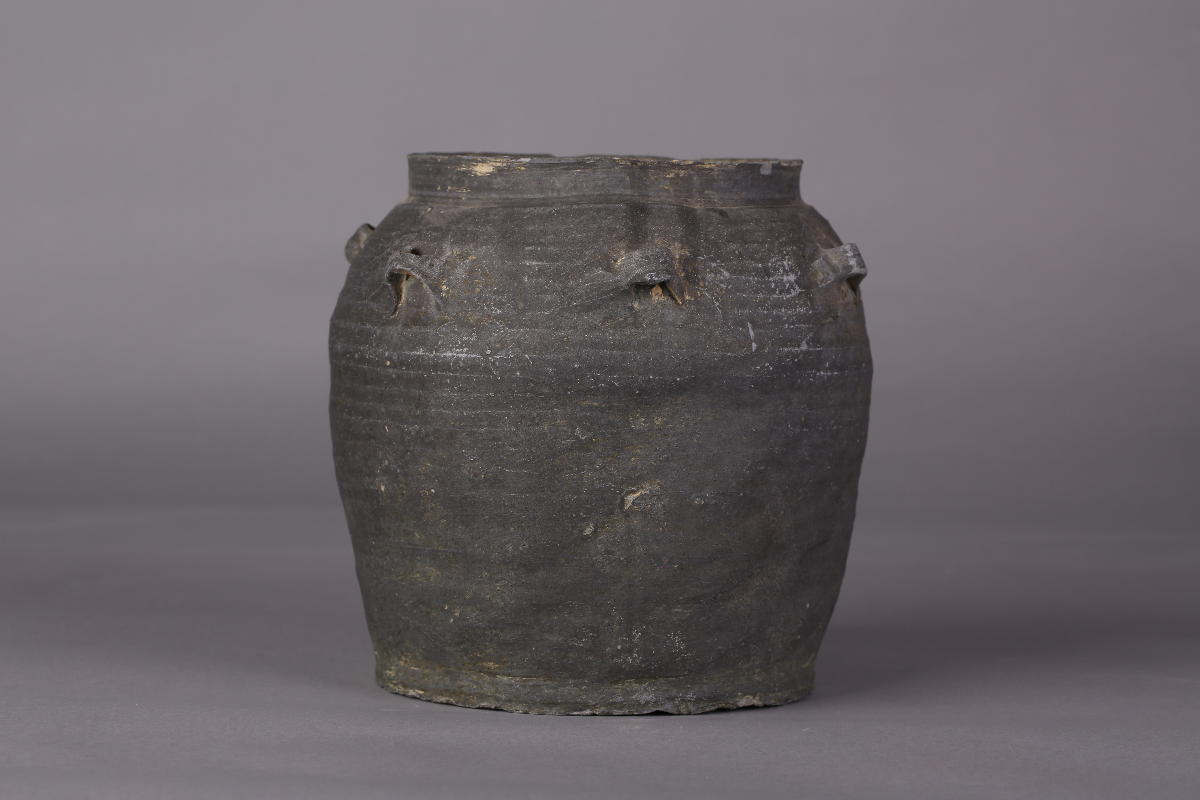 唐黑釉六系陶罐,唐代陶制文物,宽17.5厘米,高17.5厘米,口径12.5厘米,底径14厘米,属于三级文物。唐黑釉六系陶罐具有侈口、圆唇、短颈以及六个系耳的特征。这些系耳通常用于穿绳提携或固定,方便搬运和存储。罐体通常较为饱满,底部平稳,整体风格以质朴自然为主。它们常被用作盛放粮食、酒水等日常用品。釉色以黝黑为主,釉面明亮。这种黑釉不仅色彩鲜艳,而且耐温性高,化学性能稳定,使得陶罐在使用过程中更加耐用。作为唐代瓷器的代表作品之一,唐黑釉六系陶罐具有重要的历史和文化价值。它们不仅反映了唐代制瓷技术的高超水平,还体现了当时社会的审美观念和生活方式。同时,这些陶罐也是研究唐代历史、文化和艺术的重要实物资料。