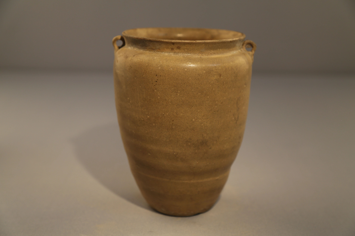 肩部左右各设置了一个竖系,这一设计不仅增强了罐体的实用性,方便搬运或悬挂,同时也为器物增添了一种对称美感。竖系的设置位置恰到好处,既不影响罐体的整体美感,又满足了实用需求。
