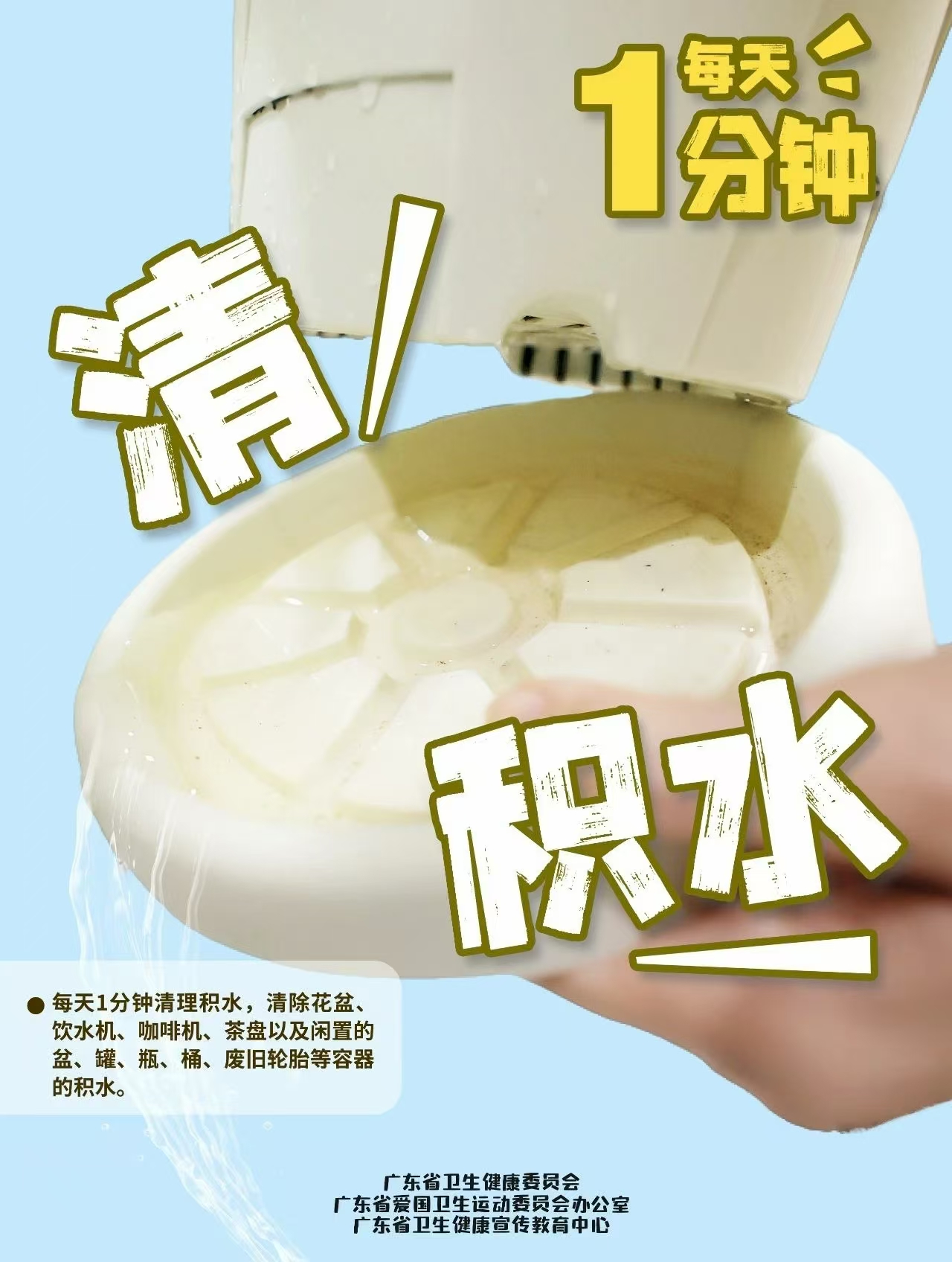 家庭每天3分钟排查孳生地。检查并清除房前屋后、阳台天台的积水点。