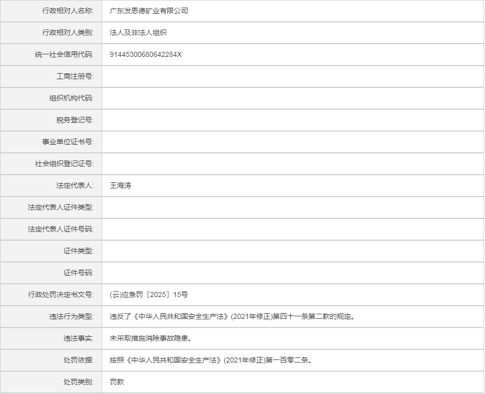 (云)应急罚〔2025〕15号广东发恩德矿业有限公司行政处罚案
