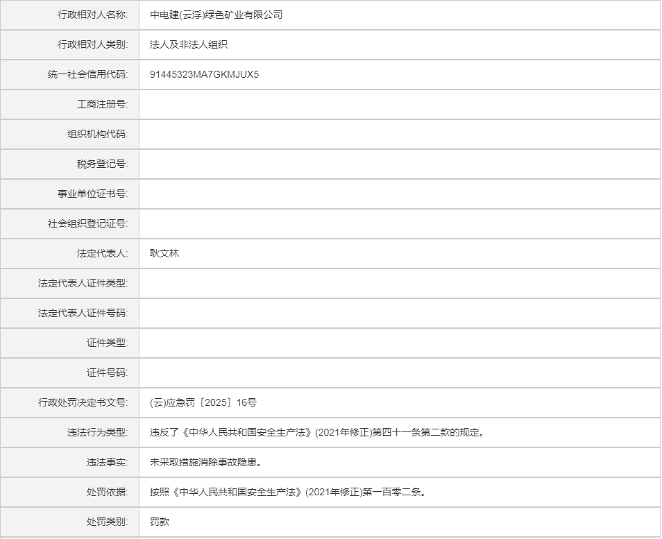 (云)应急罚〔2025〕16号中电建(云浮)绿色矿业有限公司