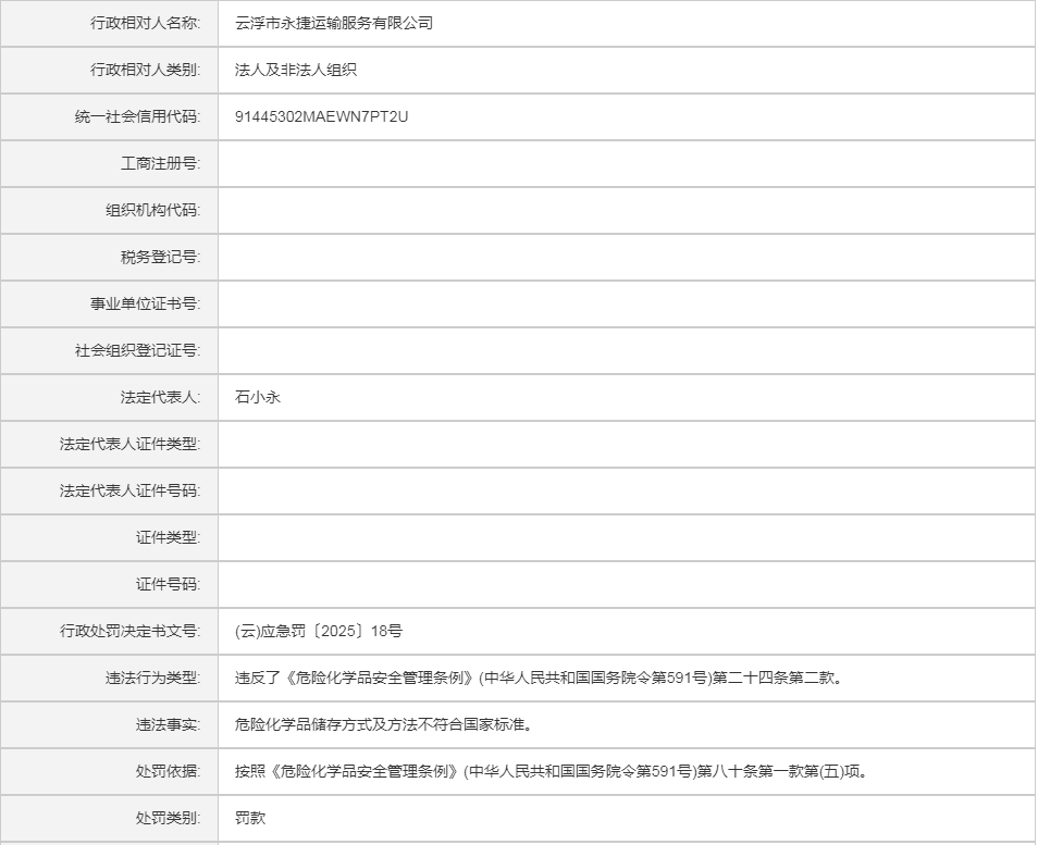 (云)应急罚〔2025〕18号云浮市永捷运输服务有限公司行政处罚案