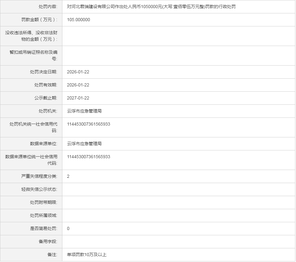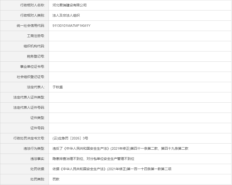 (云)应急罚〔2026〕3号河北君瑞建设有限公司行政处罚案