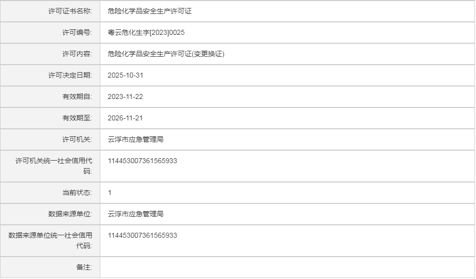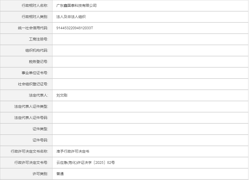 云应急(危化)许证决字〔2025〕82号广东鑫国泰科技有限公司危险化学品安全生产许可证(变更换证)