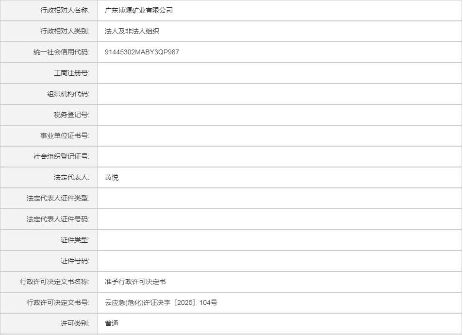 云应急(危化)许证决字〔2025〕104号广东博源矿业有限公司危险化学品经营许可证(延期换证)