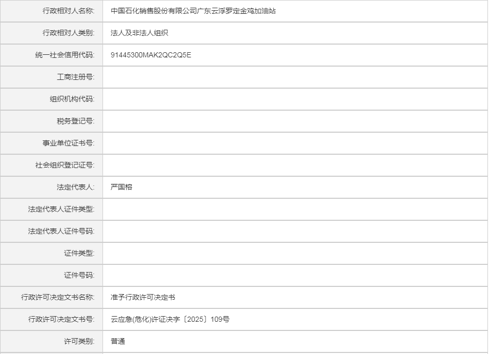 云应急(危化)许证决字〔2025〕109号中国石化销售股份有限公司广东云浮罗定金鸡加油站危险化学品经营许可证(变更换证)