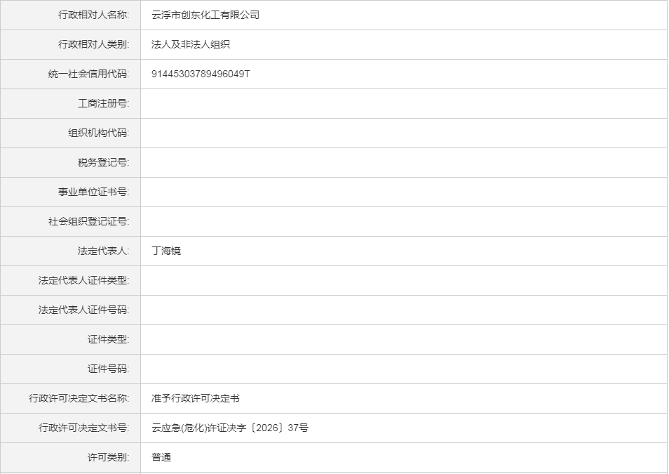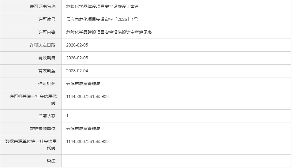 云应急(危化)许证决字〔2026〕37号云浮市创东化工有限公司危险化学品建设项目安全设施设计审查意见书