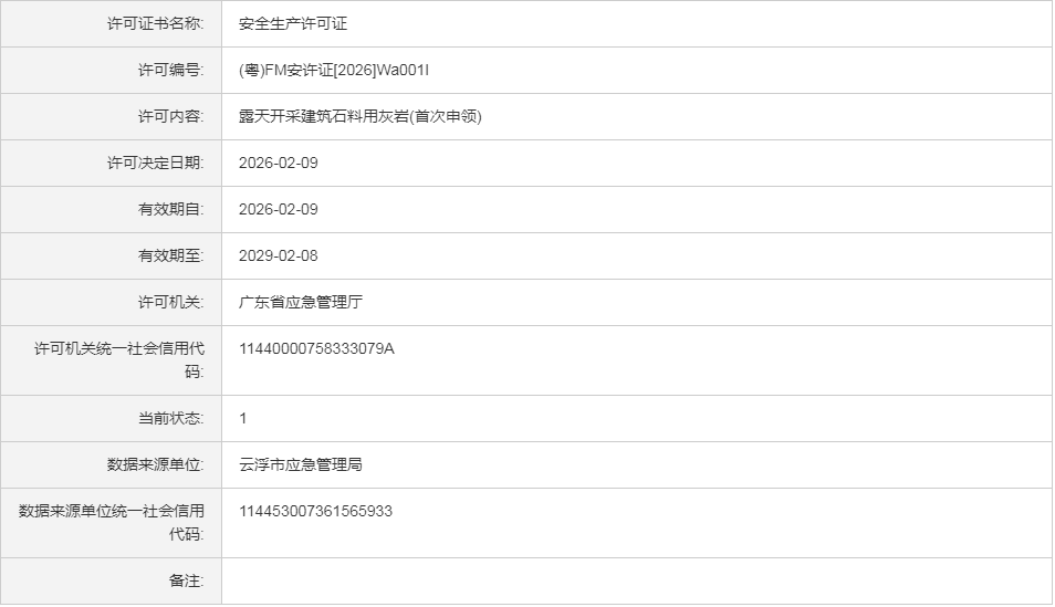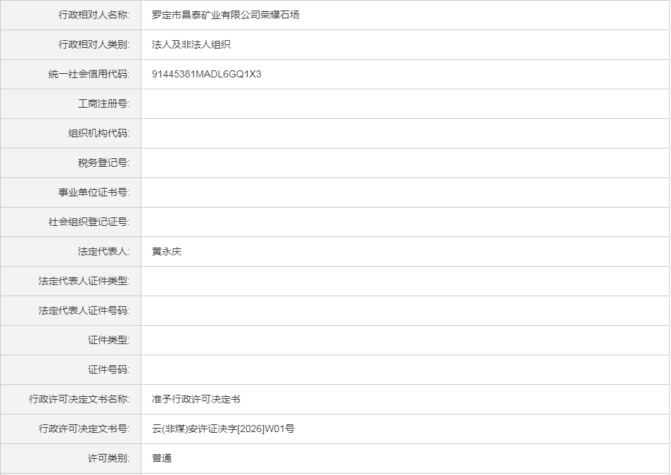 云(非煤)安许证决字[2026]W01号罗定市昌泰矿业有限公司荣耀石场露天开采建筑石料用灰岩(首次申领)