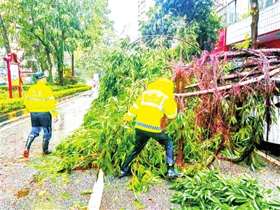 本报讯 (云浮融媒记者 罗强 钱枫 冯锦标 通讯员 云公宣 林镇锋) 3月29日至30日,我市多地遭遇强降雨、冰雹、大风等强对流天气,部分区域出现树木倒伏、护栏损毁、路面受阻等险情。面对极端天气,云浮公安广大民辅警闻令而动,冲在一线,化身“清障员”,快速清理倒塌的标志标牌、树木等障碍物,及时疏导交通、排除隐患,全力保障群众出行安全畅通。抢险救援中,一幕幕暖心场景接连上演。